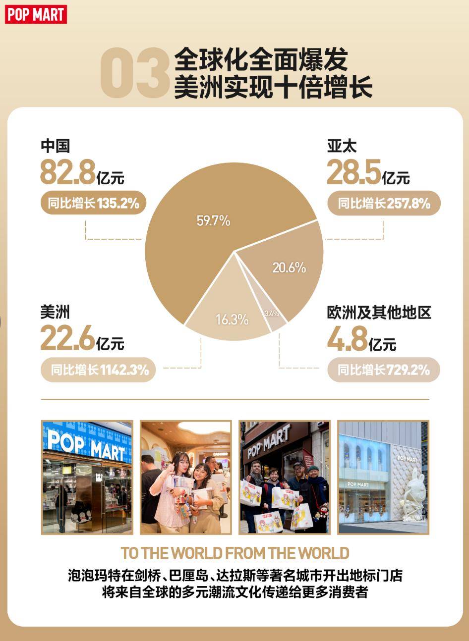 2025年10月21日,泡泡玛特发布第三季度业务状况公告。数据显示,公司第三季度整体收益同比增长245%至250%,中国市场收益同比增长185%至190%,海外收益同比飙升365%至370%。
